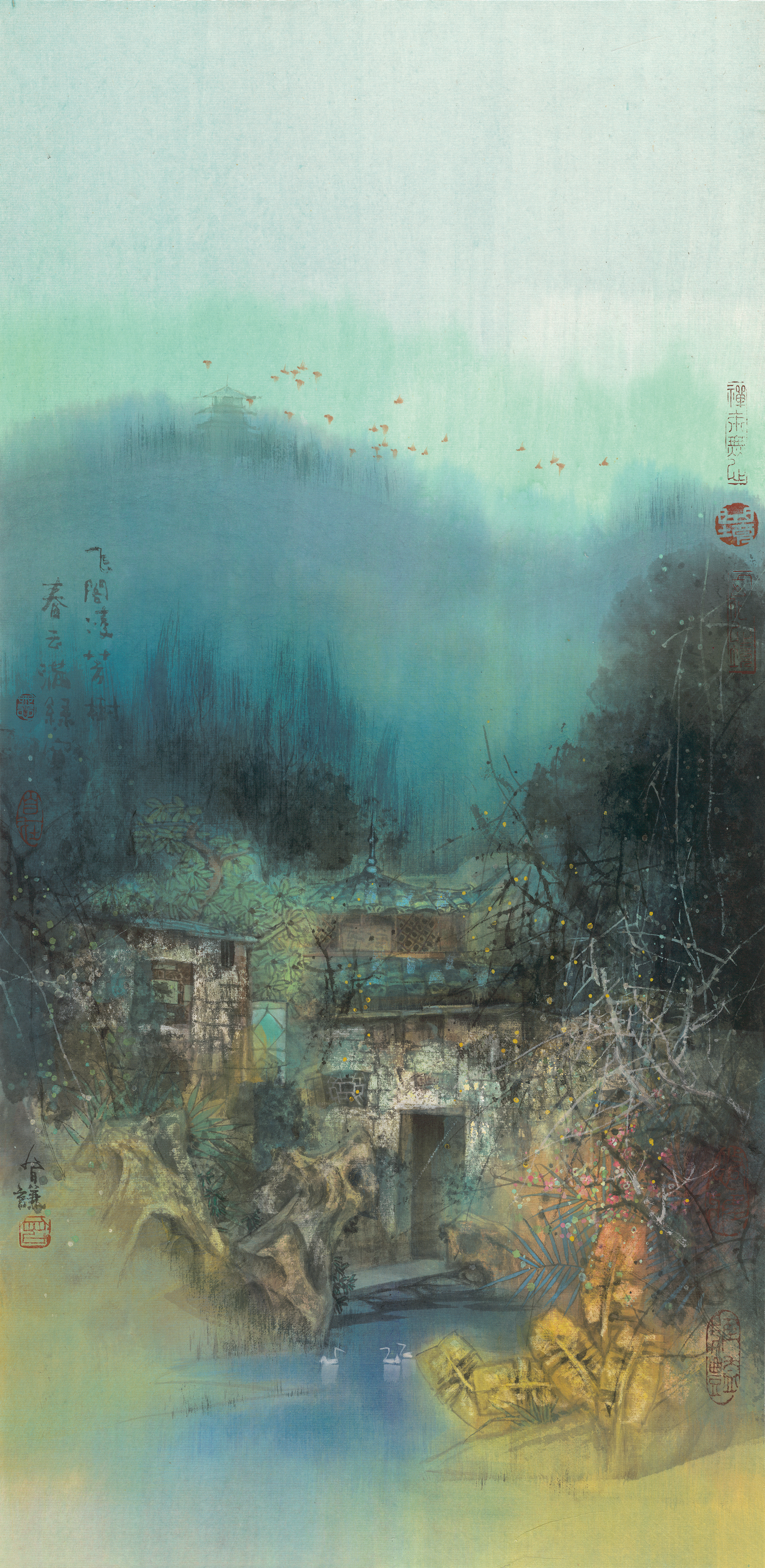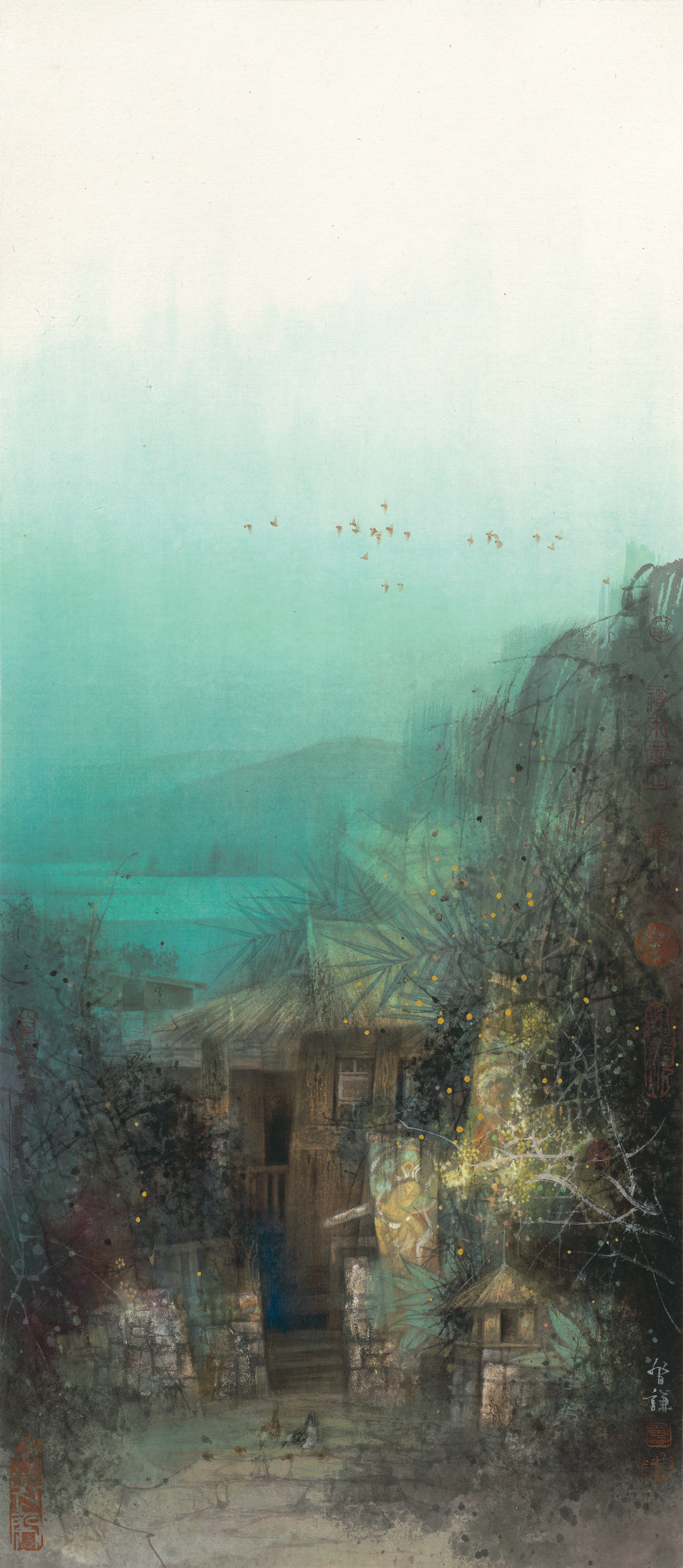 其绘画风格色彩丰富,造型古朴厚重,取景多为湘、贵、川多地的古老村落。在其十多年的闭关创作过程中,力尽所能的精进努力,只为能以道心入画,以笔墨修行,以艺术追求极致为根本,在追求美学本质上的超越之同时,尽心表达出道的深远意境。